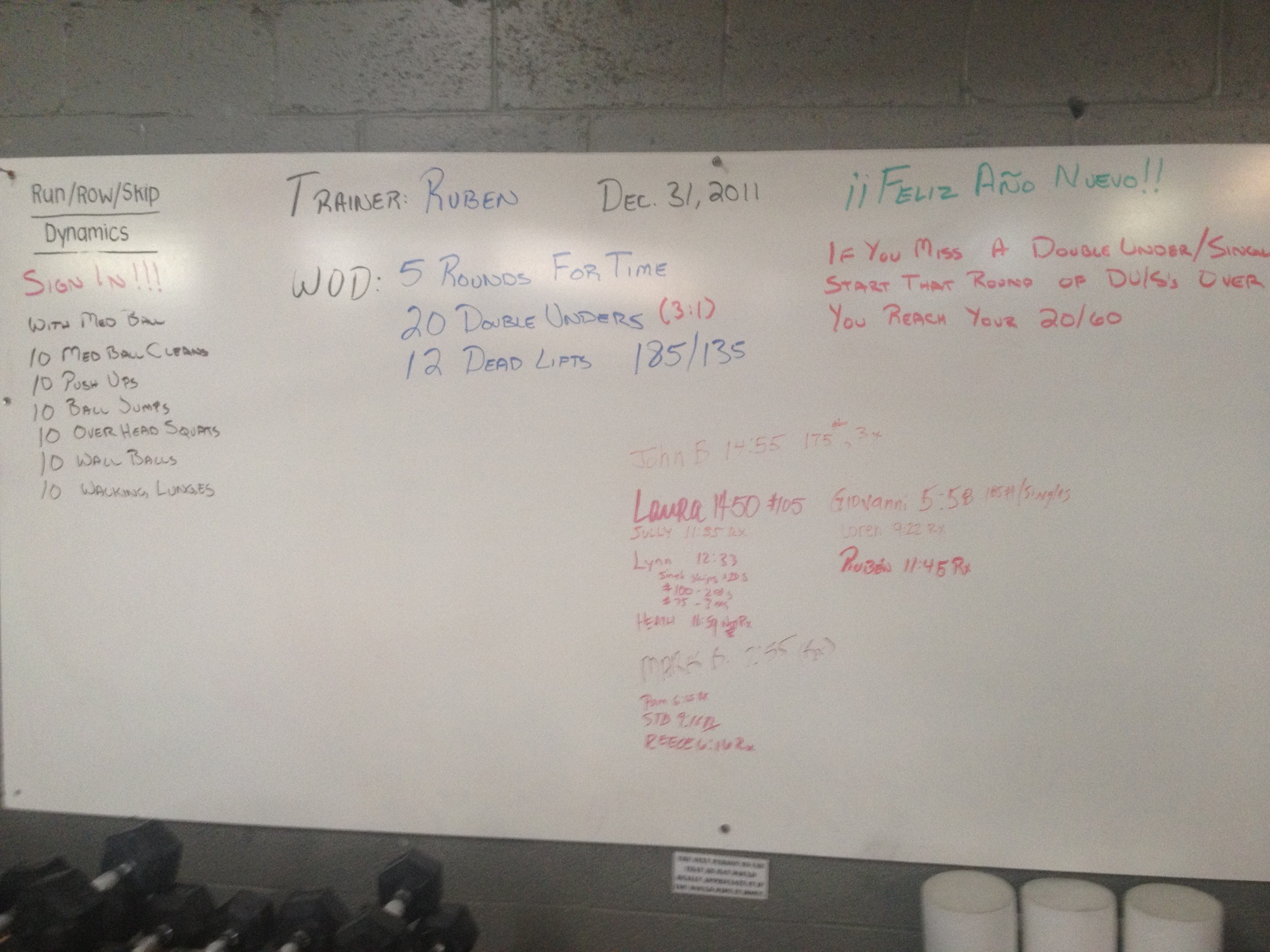 Double unders and dead lifts January 2, 2012August 29, 2019 / ugzruben Did Saturdays wod today. Warm up: Skipped rope Dynamic stretches W.O.D.: For time Five rounds 20 Double unders * 12 Dead lifts, 185lbs * the double unders need to be consecutive. If you miss you have to start that round over. Results: 11:45 Rx Share this: Click to share on X (Opens in new window) X Click to share on Facebook (Opens in new window) Facebook Like Loading...