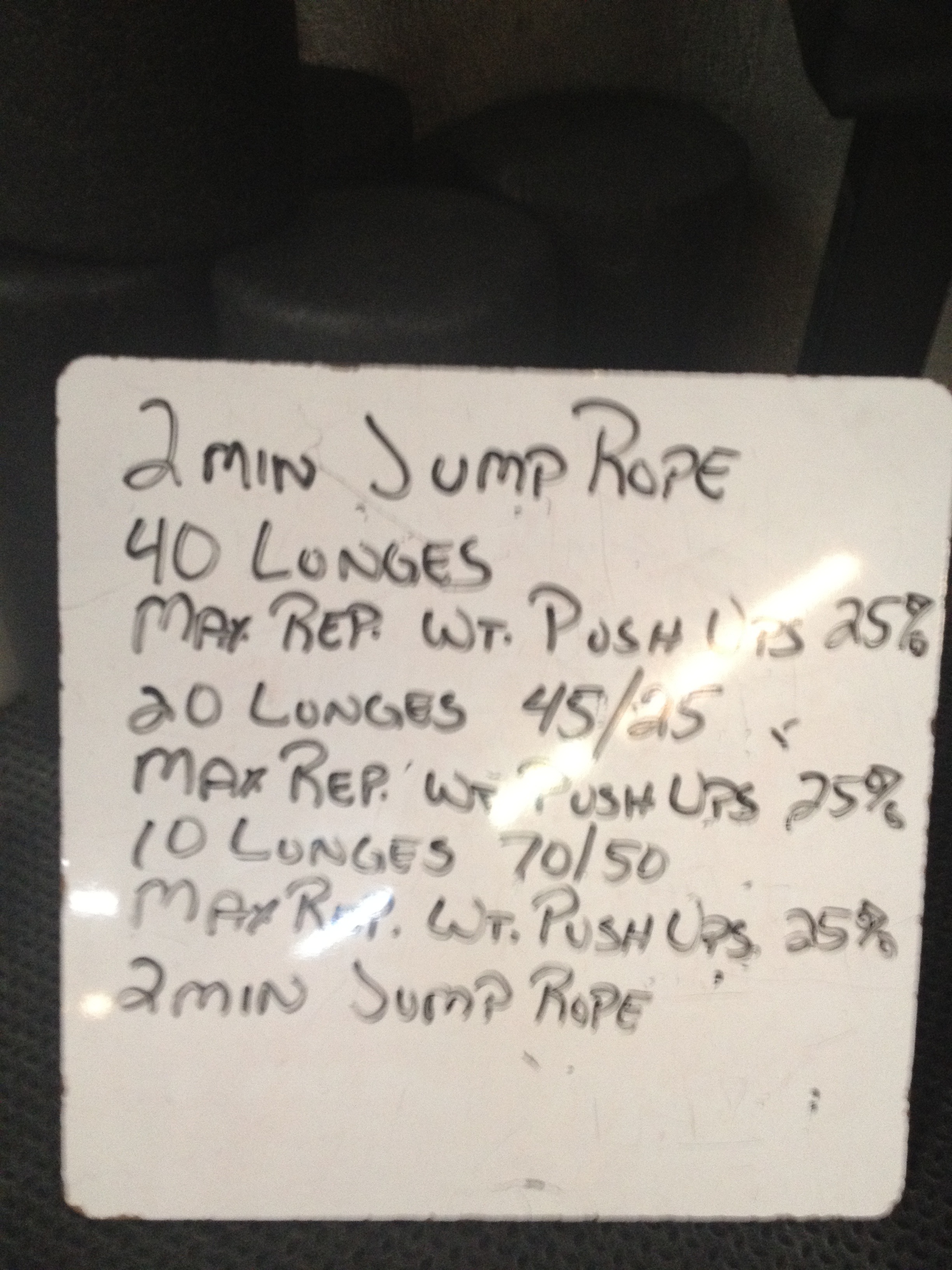 - Max rep – weighted push ups @ 25% bw – 8